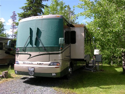 While in Dawson Creek we readied the motorhome for the journey north and picked up more information for the journey. While cleaning the bugs off the motorhome windshield our wash brush broke, so we bought a new one. The long drive ran the battery down on the car, so we bought a battery charger. The battery is not old, but had some abuse when we forgot to unplug things in the car while towing, so we think it is now weak.