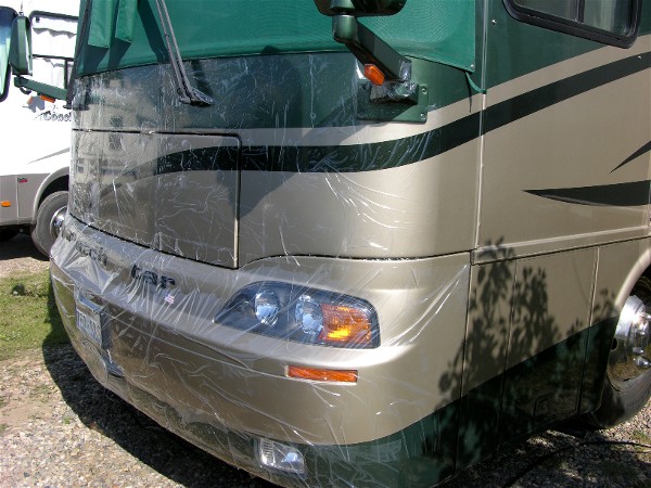 To protect the motorhome and car we tried a product called Transitshield, kind of thick plastic wrap. Here is how it looks: