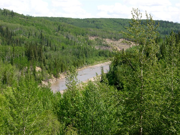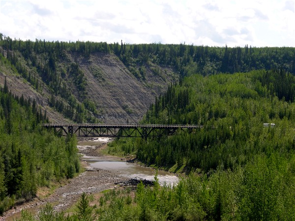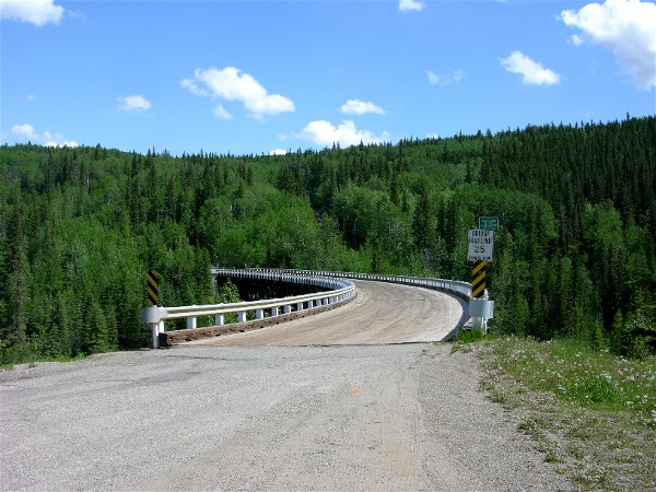 We had time so we drove north of Dawson Creek about 20 miles and took the old Alaska Highway route to the Kiskitinaw Bridge over the Kiskitinaw River. It is the only original bridge left on the highway since it was bypassed by a new highway and bridge and thus preserved. Notice it is made of wood and curved: