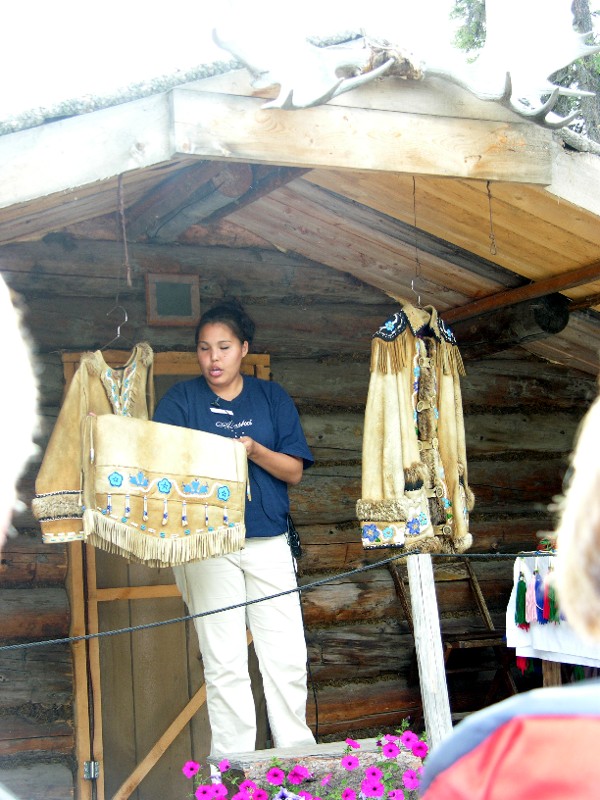 A demonstration of Dixie Alexander's work, some of which is in the Smithsonian in Washington, DC. Dixie was there to answer questions, but the girls from the ship, who are Athabascan, did most of the talking.
