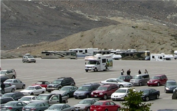 Just after we crossed the second pass and into Jasper National Park we stopped at the Icefields Visitors Center. We saw our friends' motorhomes from Lake Louise in the parking lot. The Visitors Center is directly across from the Athabasca Glacier and here is a picture of the Athabasca Glacier from the Visitors Center: