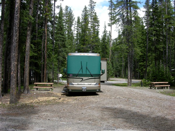 We drove only 83 miles to Lake Louise, AB but it was a very scenic trip through Kootenay and Banff National Parks. A ranger the day before had told us three places to stop on the route, but because of our size we could only stop at the first. We took many pictures at that first stop and here is a web page of the Kootenay Valley. We saw deer and elk on the side of the road but missed a bear someone else at the viewpoint saw.