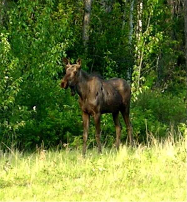 After dinner we drove back up the highway looking for wildlife and saw this moose on the edge of the woods. The moose was in the shadows and a ways away so the picture is not that good, but now we have proof we saw a moose: