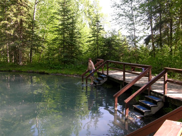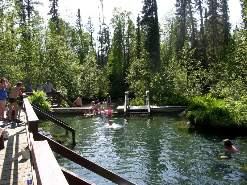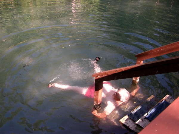 This is the Alpha pool. The water comes in this end at about 127 degrees (53C) and mixes with a cooler creek to 104 (40C) to 120 (49C) closer to the stairs and even cooler on the far end. When we came to swim earlier more people were in the hot end, but it was 86 degrees (30C) out so now most were in the cooler end: