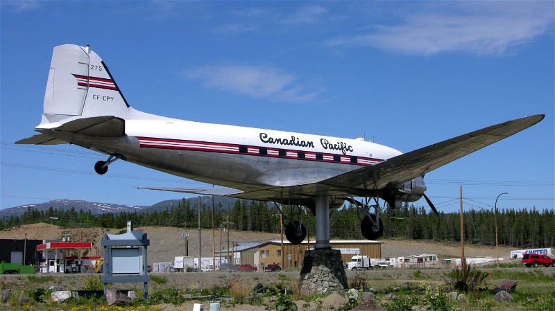 Pioneer RV Park could only let us stay two nights because they had a caravan coming in on the 14th. Still, we could stop and breathe here since we had been moving for five days. We did some grocery shopping in town, prices are much higher than further south. We looked around the area and had to take a picture of the Whitehorse Airport weather vane, a DC-3 that is balanced to work in the slightest breeze. It is the world's largest weathervane.