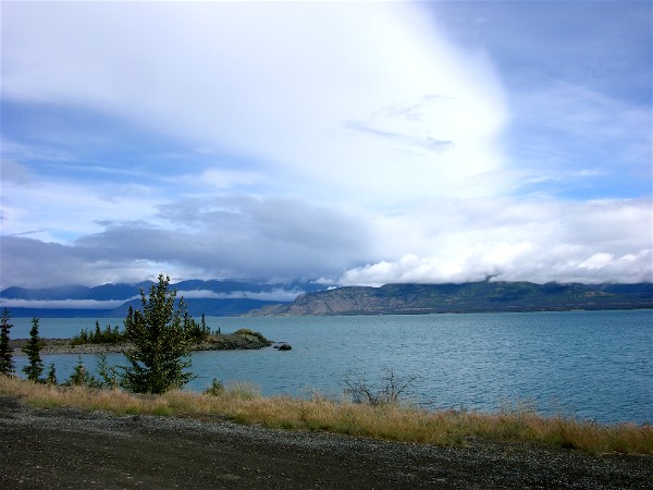There was a construction zone at the south end of the lake that was new since June. It was a six mile pilot car section. Here is a picture of Sheep Mountain to the north as we waited for the pilot car: