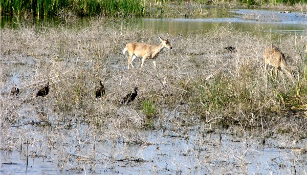 The fun started when some deer came into view and walked across by the glossy ibis, first one came and then the other: