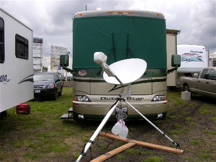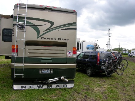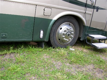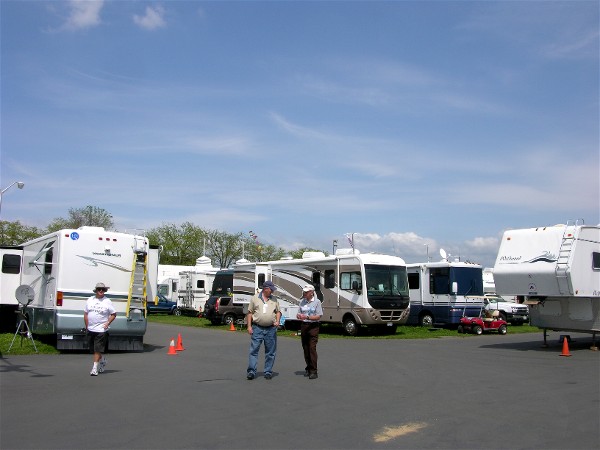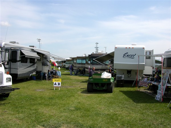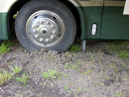 It took a long time before we were parked, it had rained the day before and much of the parking was wet so they had us sitting while they figured out where to put us. It had not rained where we were the day before, about 40 miles as the crow flies, but they had 0.62". Finally they directed us to one area and told Diane not to stop until told or she got stuck. The front wheels did sink, but the rear was solid: