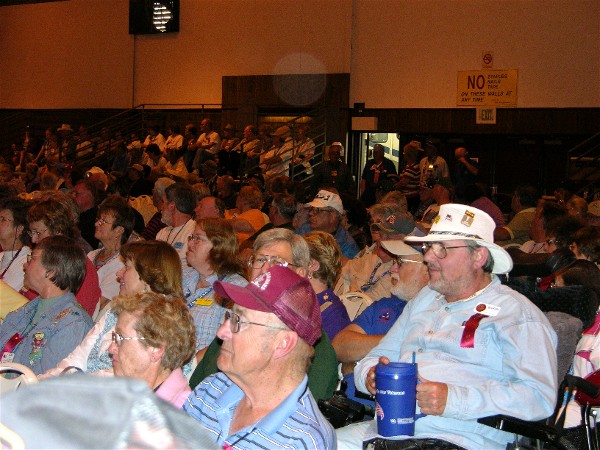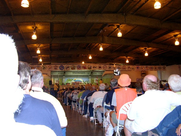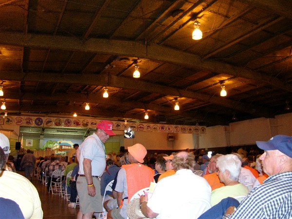 Here are views of some friends at the evening door prizes. Ray is looking at the camera but most of his face is hidden behind a red hat: