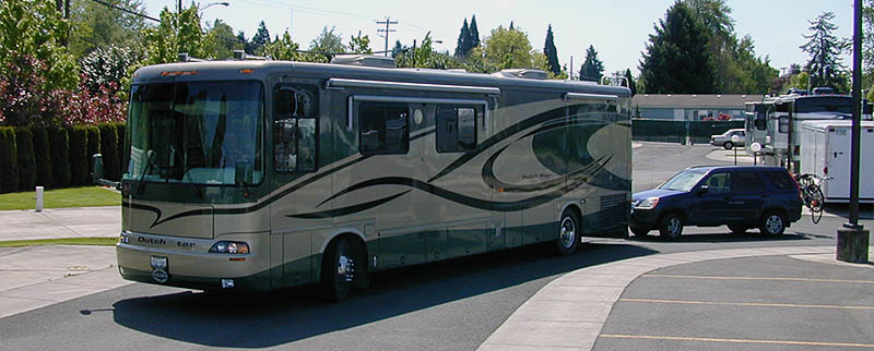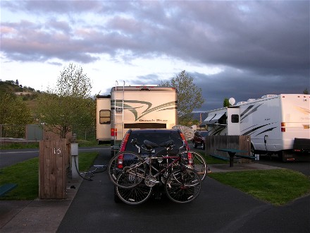 After the Advisory Council meeting finished at about noon on the 29th we broke camp and drove 216 miles to Pear Tree RV Park in Phoenix, OR, where we stayed in April 2005. Here is our campsite, where we didn't bother to unhook the car: