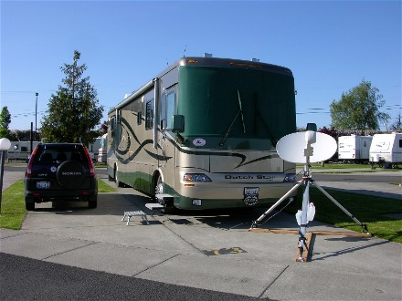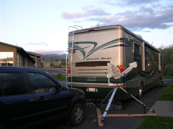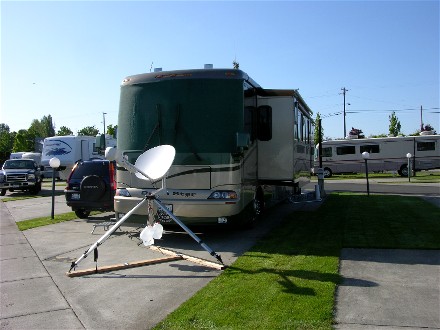 May 1st we checked in, saw some others we know from the Escapade. We drove around the Eugene area and came back about 1PM and found out they were not getting to us that day, so we set up for the night including the satellite dish (the picture of the dish above was taken the 1st). That evening Diane's parents, our friends Ken and Joan, and us got together for dinner at the China Sun Buffet in Springfield. We all had a good time.