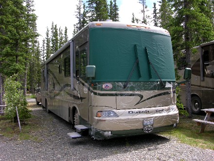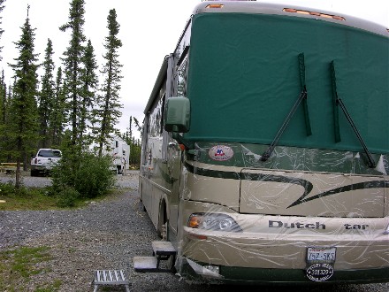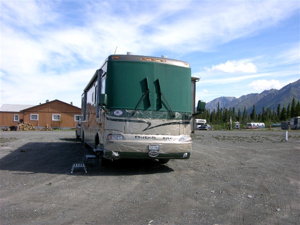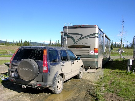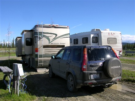 We landed at Tok RV Village. To wash the motorhome would cost $11, to wash the car it would cost $6. They also told us we would get just as dirty heading south due to more construction, so we didn't clean up the motorhome or car. Here is our campsite for two nights: