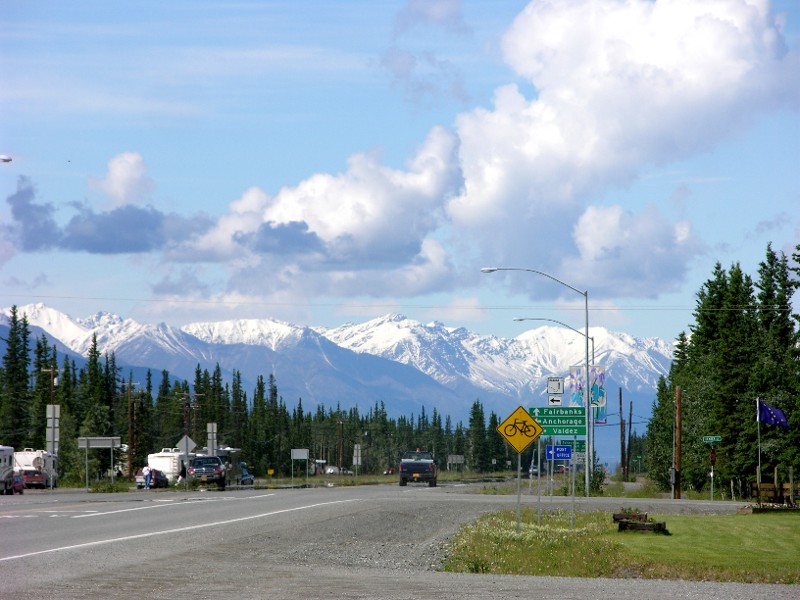 The next day we played tourist and the clouds cleared over the mountains enough to get pictures. Here is the intersection of the two highways in Tok with the mountains in the background.