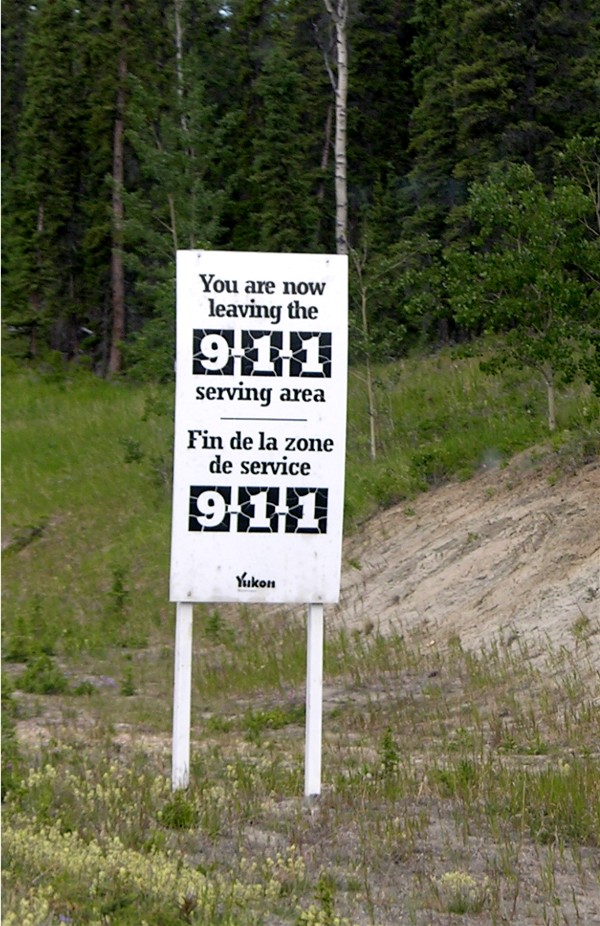 We also saw these signs going north to Dawson City, they mean that calling 911 on your phone doesn't work here. We were really not that far from Whitehorse when we saw the sign.