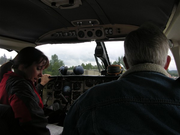 In the morning we drove to Talkeetna for our flight. Erica is our pilot and the one pointing her finger: