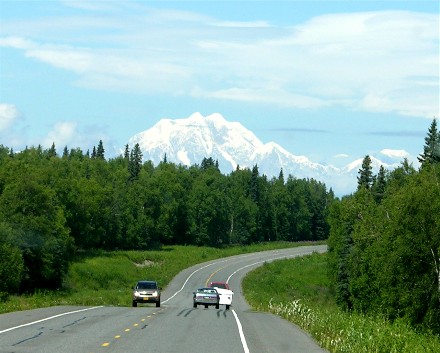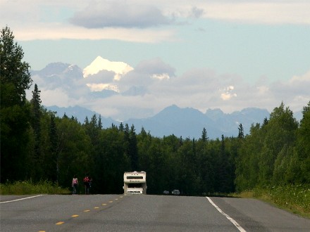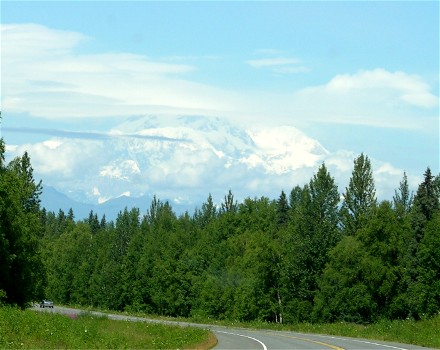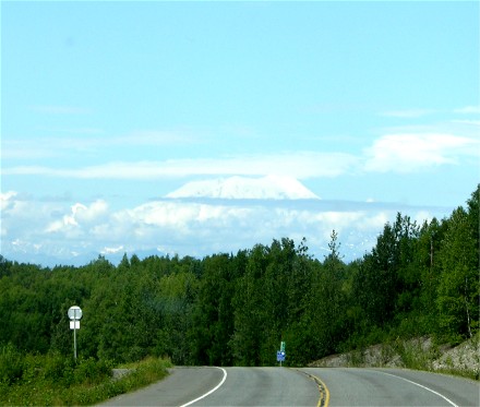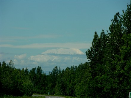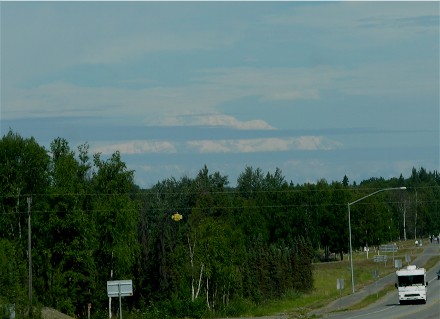 Mount McKinley (Denali) kept teasing us as we headed north. Here are some of the better pictures through the windshield, since we couldn't see it from the viewpoints a motorhome could stop at: