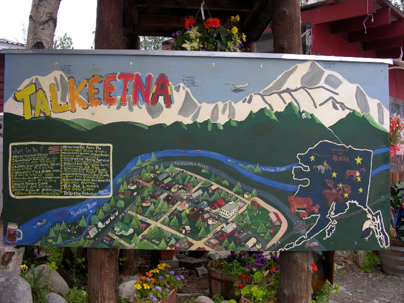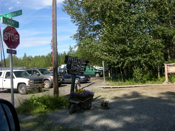 After 111 miles we stopped at the Trapper Creek Inn and set up. Then we drove back down the road and took the spur road to Talkeetna, we needed to know how long it was going to take to catch our flight seeing tour the next morning and to scope out restaurants. It took just under 35 minutes to get to the airport. Here is a picture of the famous "Welcome" sign in Talkeetna: