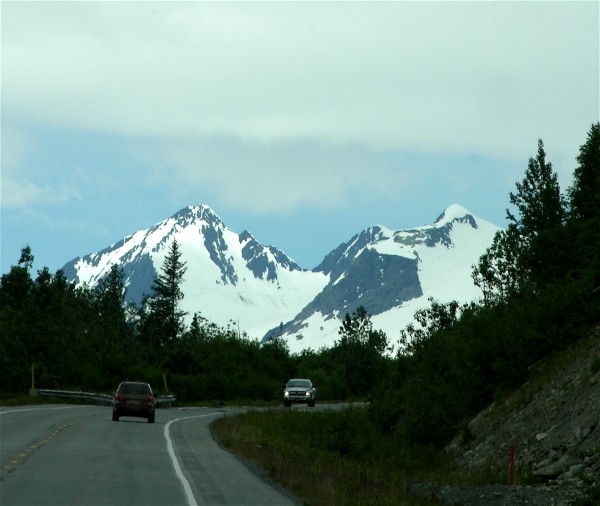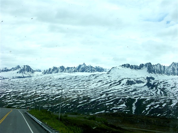 After leaving Worthington Glacier we drove over Thompson Pass and found ourselves looking at beautiful scenery through the windshield: