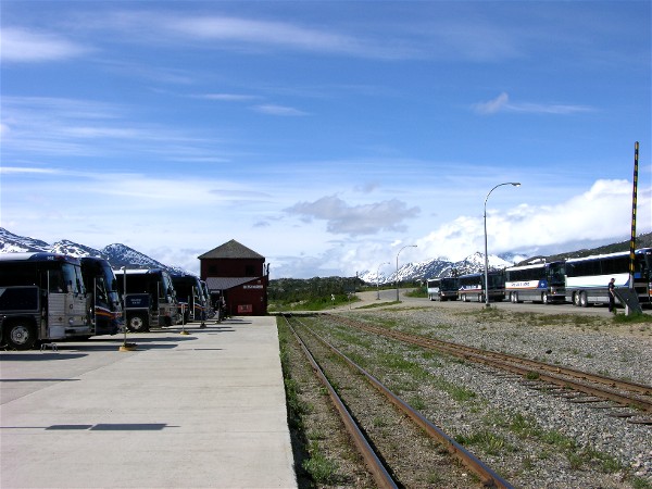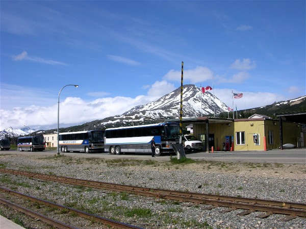 After leaving Carcross we crossed into British Columbia at the 60th parallel and eventually came to the train station and customs stop of Fraser, BC. Here is Canadian Customs checking buses on the way north.