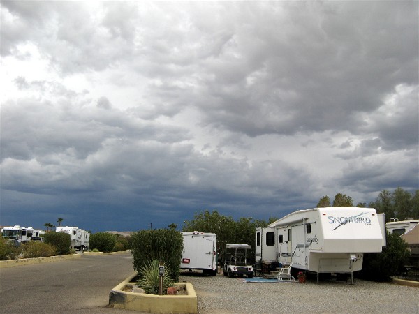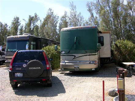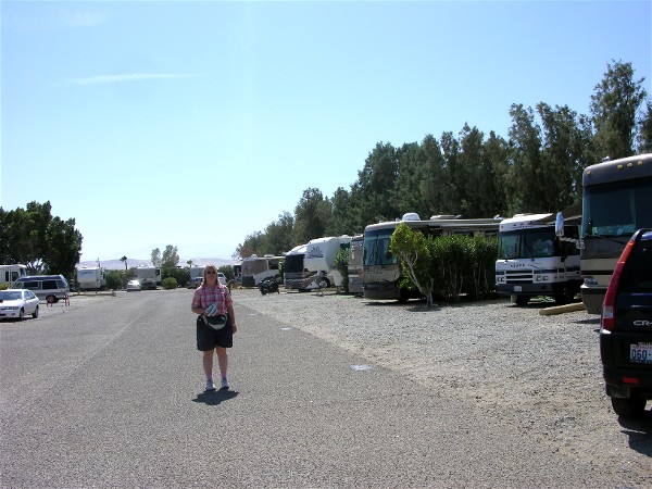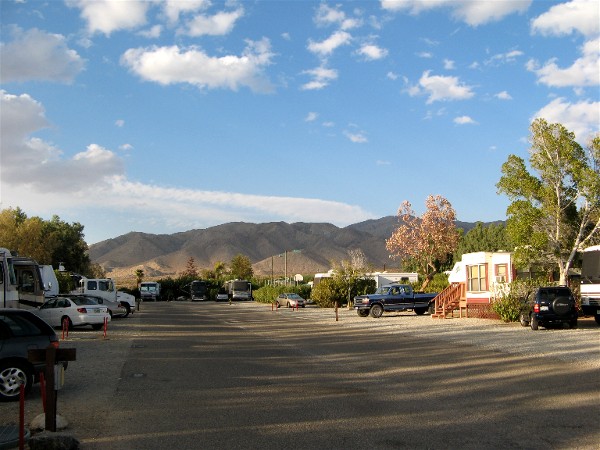 In the morning, the 19th, we drove 30 miles to Desert Pools in Desert Hot Springs and got the last 50AMP campsite. Here is our campsite: