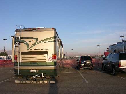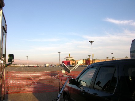After fueling up in Ehrenberg, AZ we headed all the way to the Spotlight 29 Casino in Indio which has a large RV parking area. We had driven 282 miles. Here is our camping spot and the fancy bus conversion next to us:
