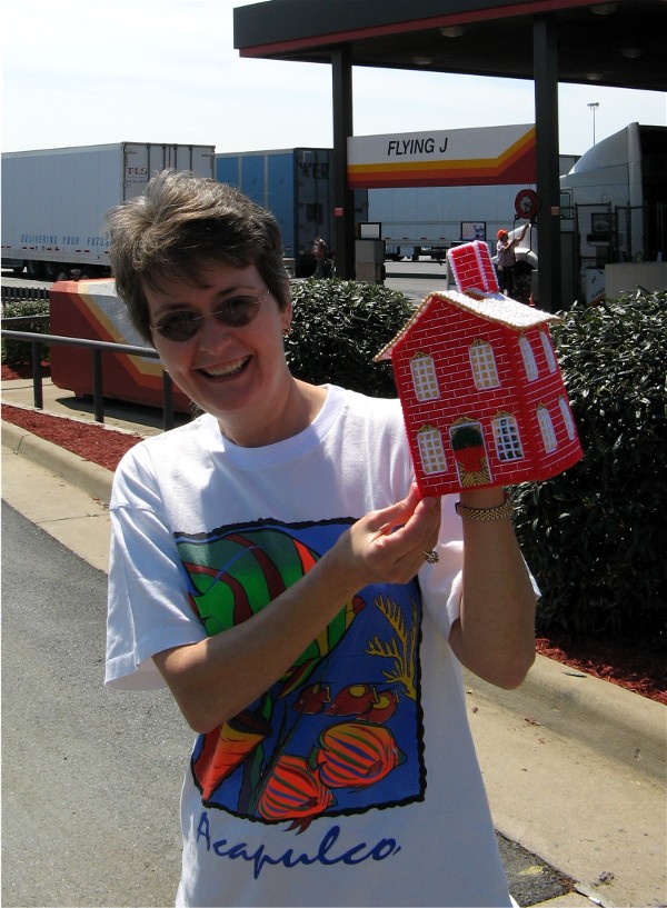 Turned out to be our friends Ken and Carolle from Jacksonville, FL. We had a great unplanned reunion. They were heading north. Diane had just finished a plastic canvas Christmas tissue box for Carolle and was wondering where to store it for two months since we were not going to see Carolle until late November. Problem solved, Carolle was thrilled to get the box as these photos document: