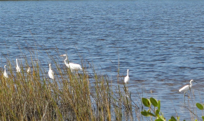 A great egret and some snowy egrets. Notice the great egret has a yellow bill and the snowy egrets have black bills: