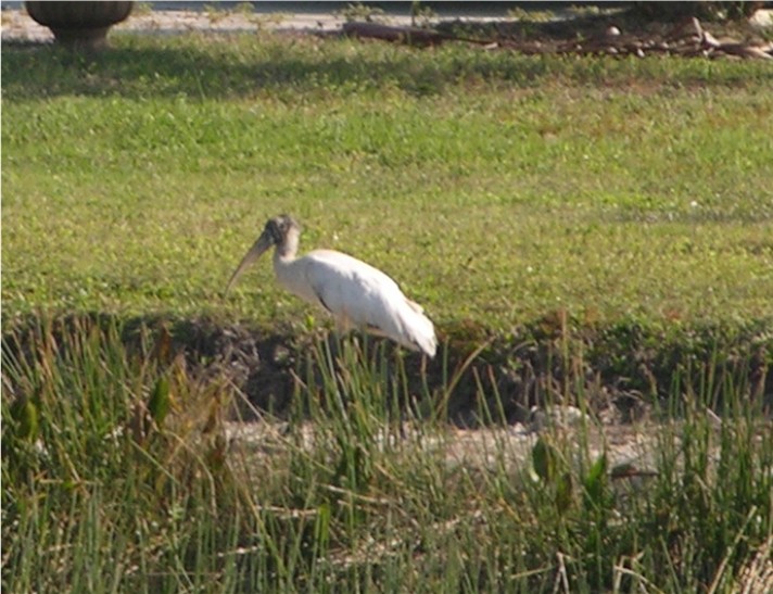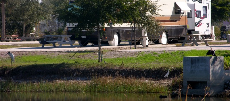 From the front of the motorhome we can see many birds. Here is a wood stork on the left, some ducks in the water and an anhinga on the concrete: