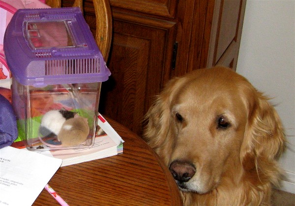 Taylor needed to clean the mice cage so she moved them to a smaller place and Simba kept guard: