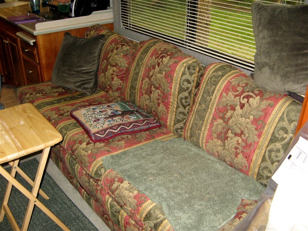 Diane's parents' new sofa bed in their motorhome. Because of the decor changes Diane will be making many replacement plastic canvas items to match the new colors.