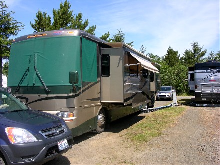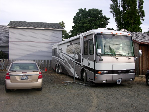 June 28th, Thursday, things got interesting. Diane's father, Gregg, had redness and swelling around his navel and ended up in Portland in the hospital for a CAT scan to decide if he was getting an emergency hernia surgery that evening if the bowels were involved, or a more ordinary hernia surgery if the bowels were not involved. At 10:30PM they found the bowels were not involved and much of the credit goes to the doctor at Seaside Urgent Care who pushed it back in. The surgery was Saturday evening and Rosalie got back to the motorhome at midnight to rest and make sure their cat was fed and his litter box clean. The next morning she brought Gregg back to the motorhome and we helped tear down camp and Rosalie drove the motorhome behind the store where we helped set up, including internet. Here is the motorhome.