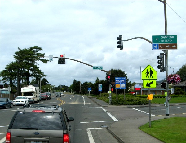 We got an early start on June 16th because we wanted a choice of campsites at our destination. Don and Nicky pulled out about 7:45AM on their way to Newport, OR and we got going about 8:45AM and headed north. We took I-5 until the south part of Portland and then worked our way to US26 going west. We hooked up to US101 north just south of Seaside. Here is downtown Seaside through the windshield: