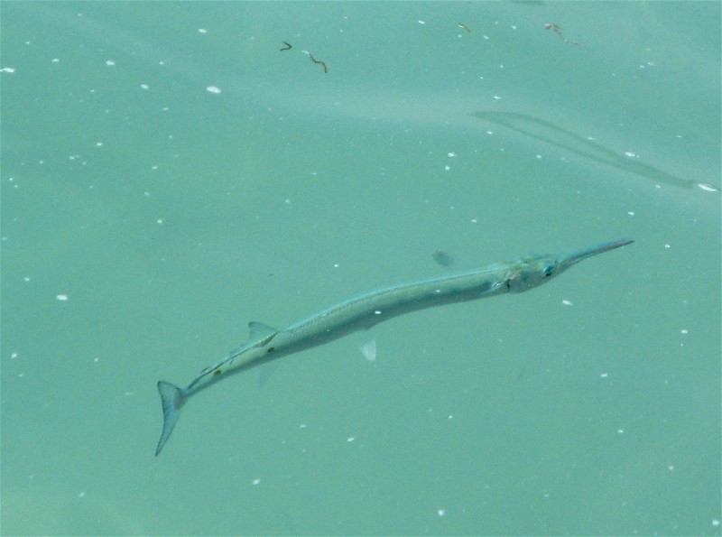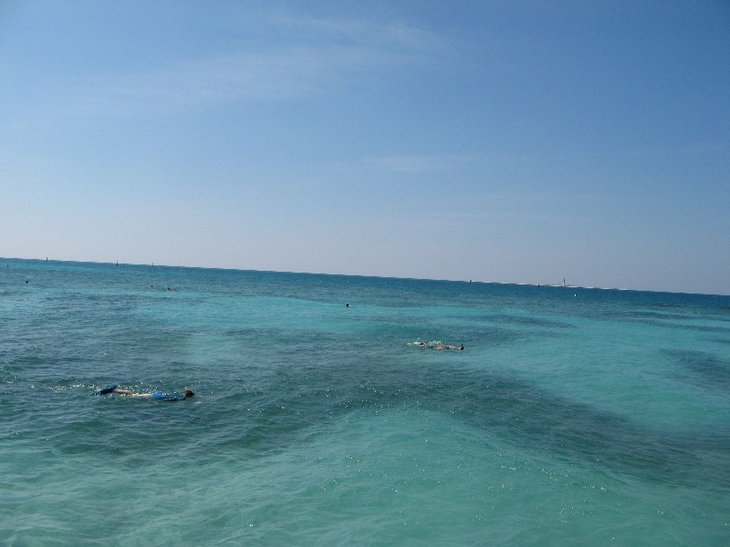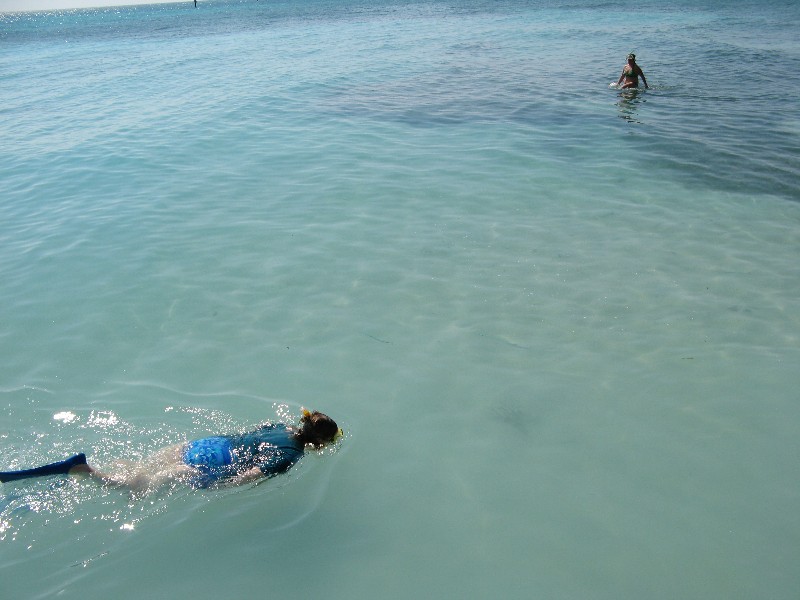 After a bit Bill felt a bit queasy, he hadn't fully recovered from the rough ride out. Then Bill got foot cramps, not uncommon for him with fins. Between the two problems he decided he was not in good shape to snorkel. Bill came out and walked the perimeter while Diane snorkeled. Here is Diane in the water: