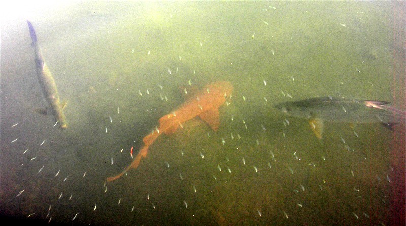 The nurse shark and tarpon were still by Turtle Kraals. This photo has the contrast turned up to make them stand out: