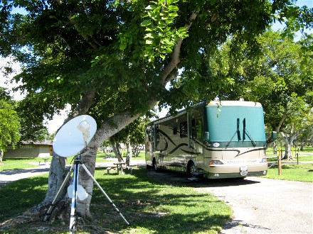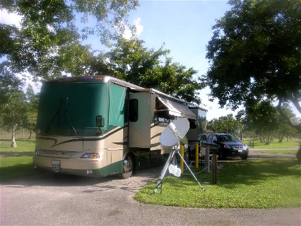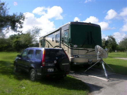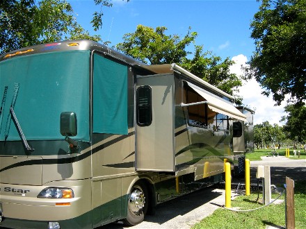 October 15th we got up a bit early and drove 277 miles to Larry and Penny Campground in Miami, Florida. The last 30 miles were through mostly stop and go traffic so we did not get setup until after 5PM. The 50AMP was messed up at our campsite so we had to use 30AMP and in the close to 90 degree temperatures and high humidity it had trouble keeping up. This is the only photo of our campsite and it has some haze since the lens fogged up due to coming out of air conditioning into the humid weather:
