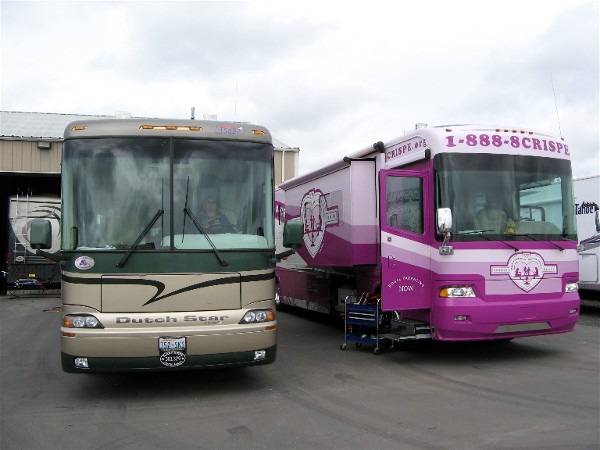 We drove 12 miles the morning of the 15th to Carrier and Sons to get our parts installed. Here is where we were camped. The Country Coach motorhome next to us has a wrap on it to advertise their cause, which is grandparents rights.