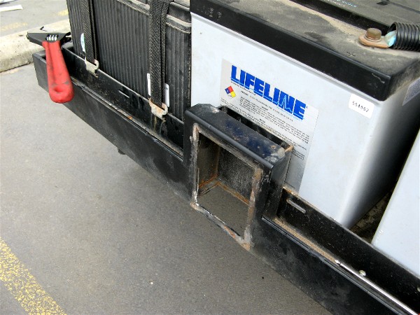 We thought both parts would be reasonably easy to replace but didn't realize one of them was welded in, the latch for the battery tray They painted the new latch, cut the welds to remove the old one and waited for the paint to dry. Here is how it looked with the old latch removed.