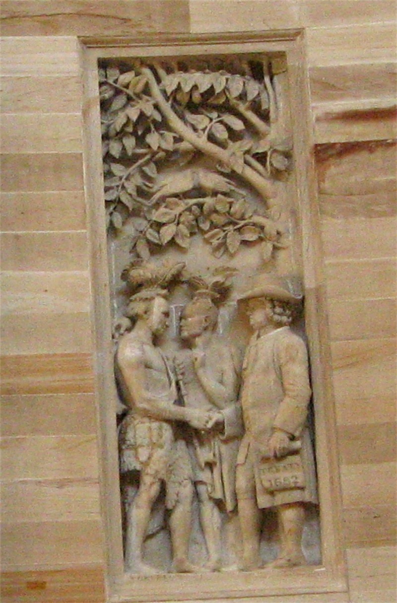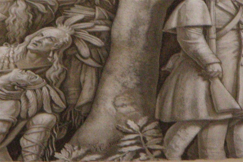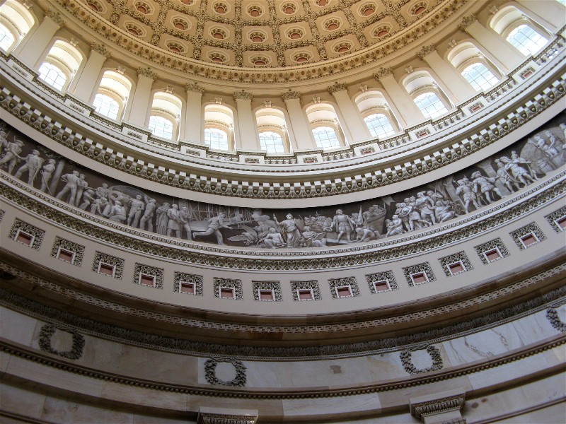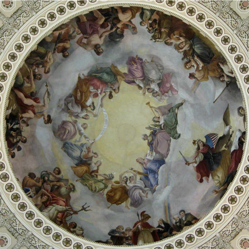 A close up of the mural on the ceiling with George Washington on the right with a blanket on his lap: