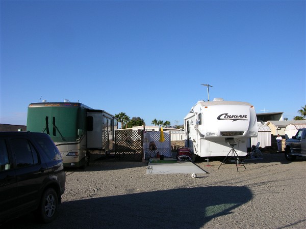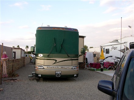 Our awning fixed, we drove 202 miles from Mohave RV Repair back to Yuma on the 31st. We parked a bit differently so we could walk around the slide: