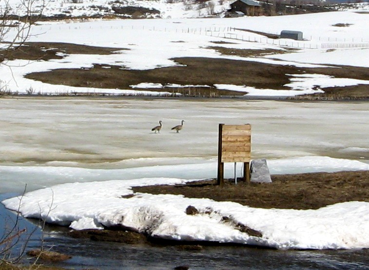 Some geese on the pond ice: