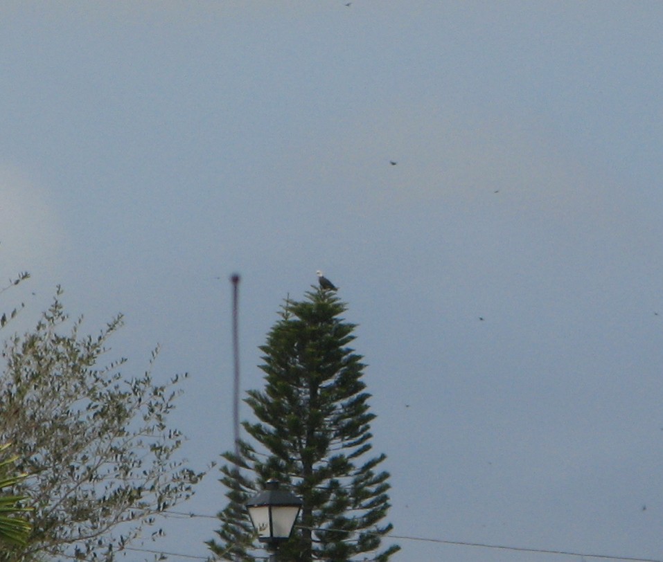 January 13th Bill saw a bald eagle flying and it landed on a Norfolk Island Pine at the other side of the campground. This crop from a telephoto shot shows it on top of the tree with some other birds in the sky: