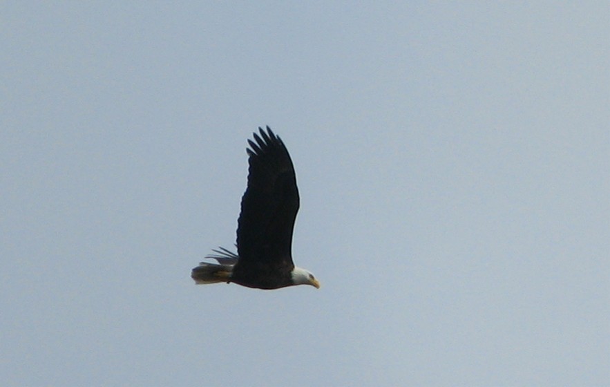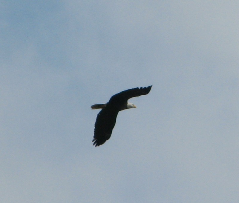 The tree was visible from the window in front of Bill's computer so he saw the bald eagle take off and head our way. Bill grabbed the Canon camera with image stabilization and headed outside to catch the bald eagle and captured these two photos:
