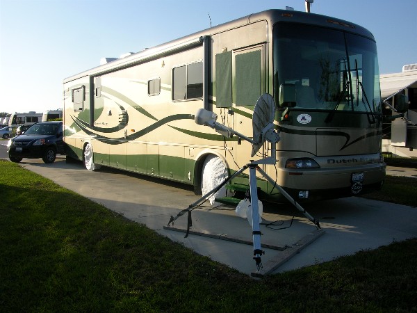 We parked the motorhome a bit differently when we came back so the car fit better. Notice we have tire covers to protect the tires from the sun and do not have a sunscreen on the windshield. All three of us want an unrestricted view of the wildlife through the windshield so we left the sunscreen off this time.