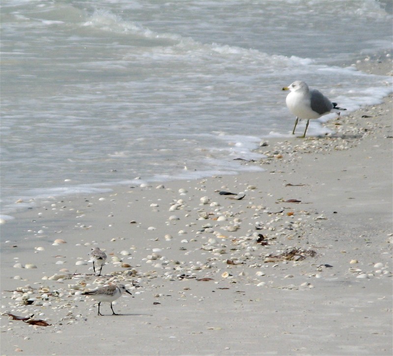 Bird watching, this is a plover. We don't know what kind (Dave might), it looks like a juvenile Snowy Plover since it has black legs. Note: Dave says it is a Sanderling.