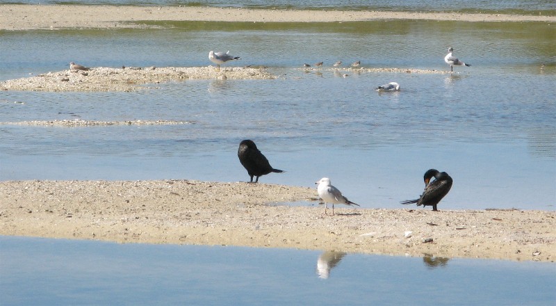A snowy egret in breeding plumage with the cormorants and gulls: