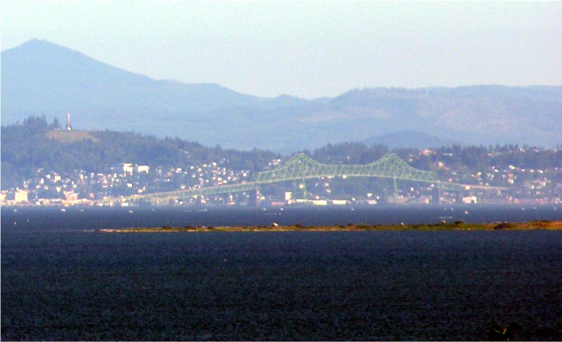 An enhanced crop from the above photo showing the bridge and Astoria Column: