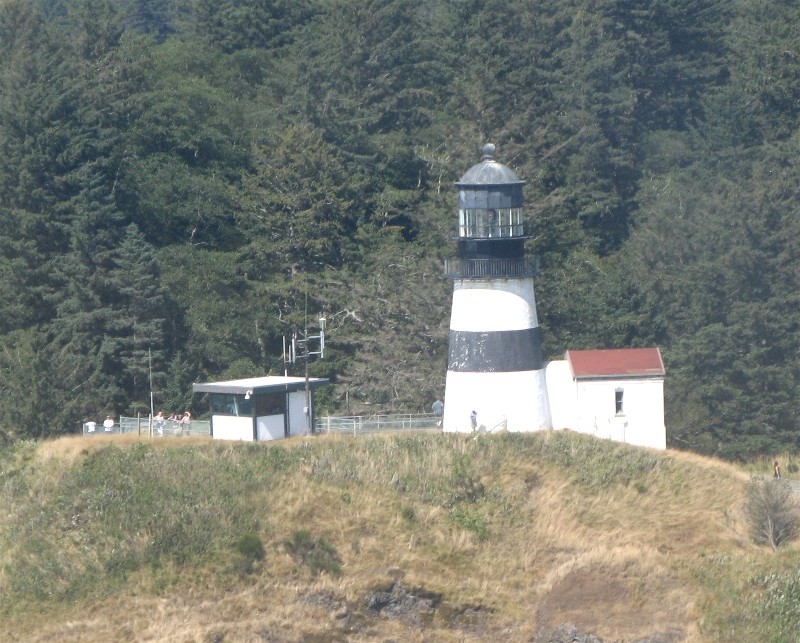 A view SE of the Lewis and Clark Interpretive Center and Cape Disappointment Lighthouse with the Columbia River behind: