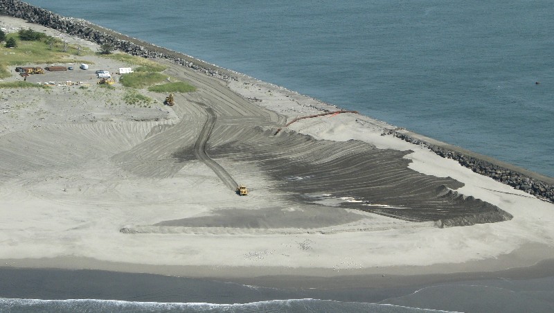 Dredging back behind the North Jetty, which was washed out by winter storms: