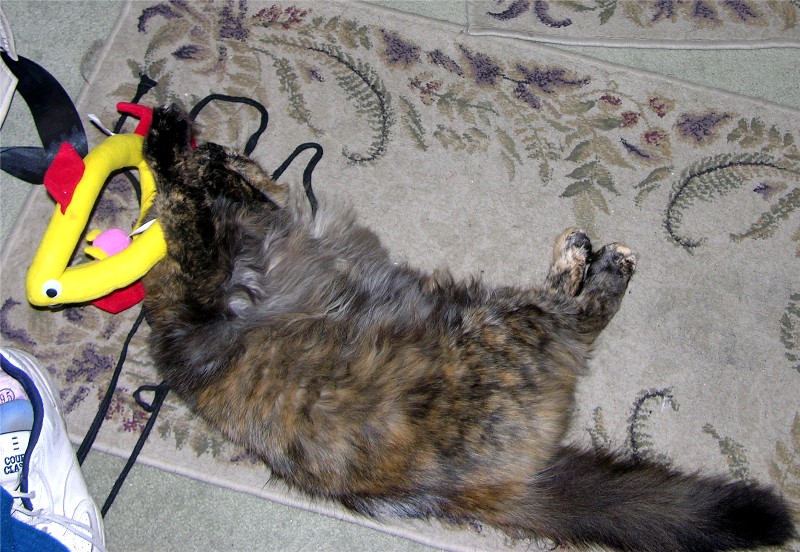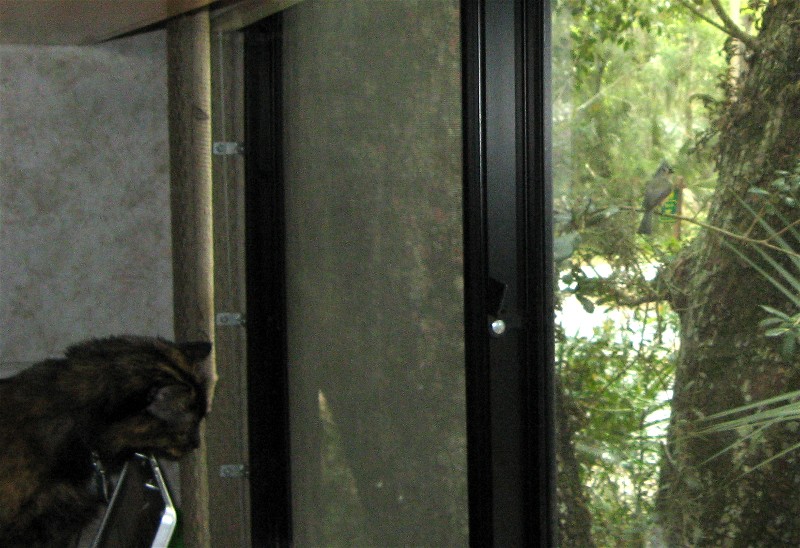 But there were also birds to watch for Evita. For the first couple days a cedar waxwing was hanging around. It is in the tree in this photo: