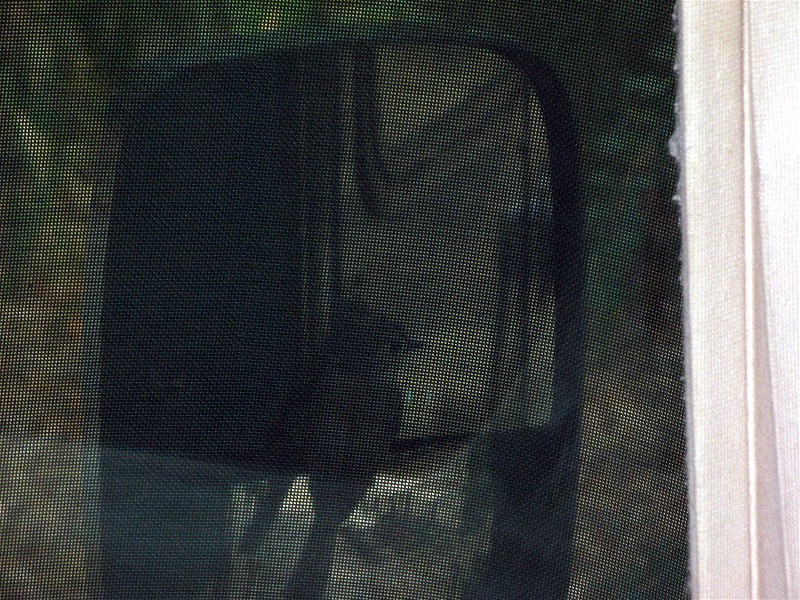 This not very good photo shows the male waxwing challenging its own image in the motorhome mirror: